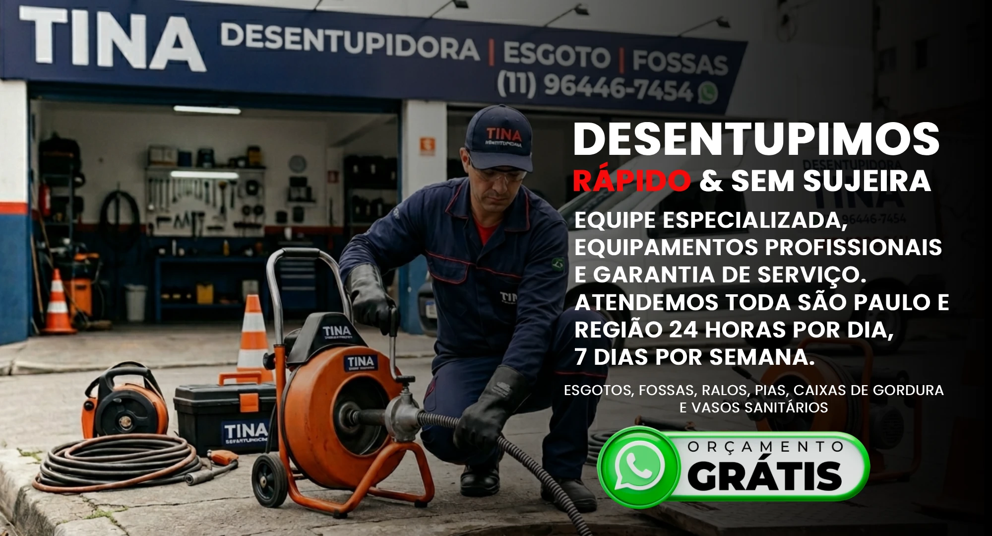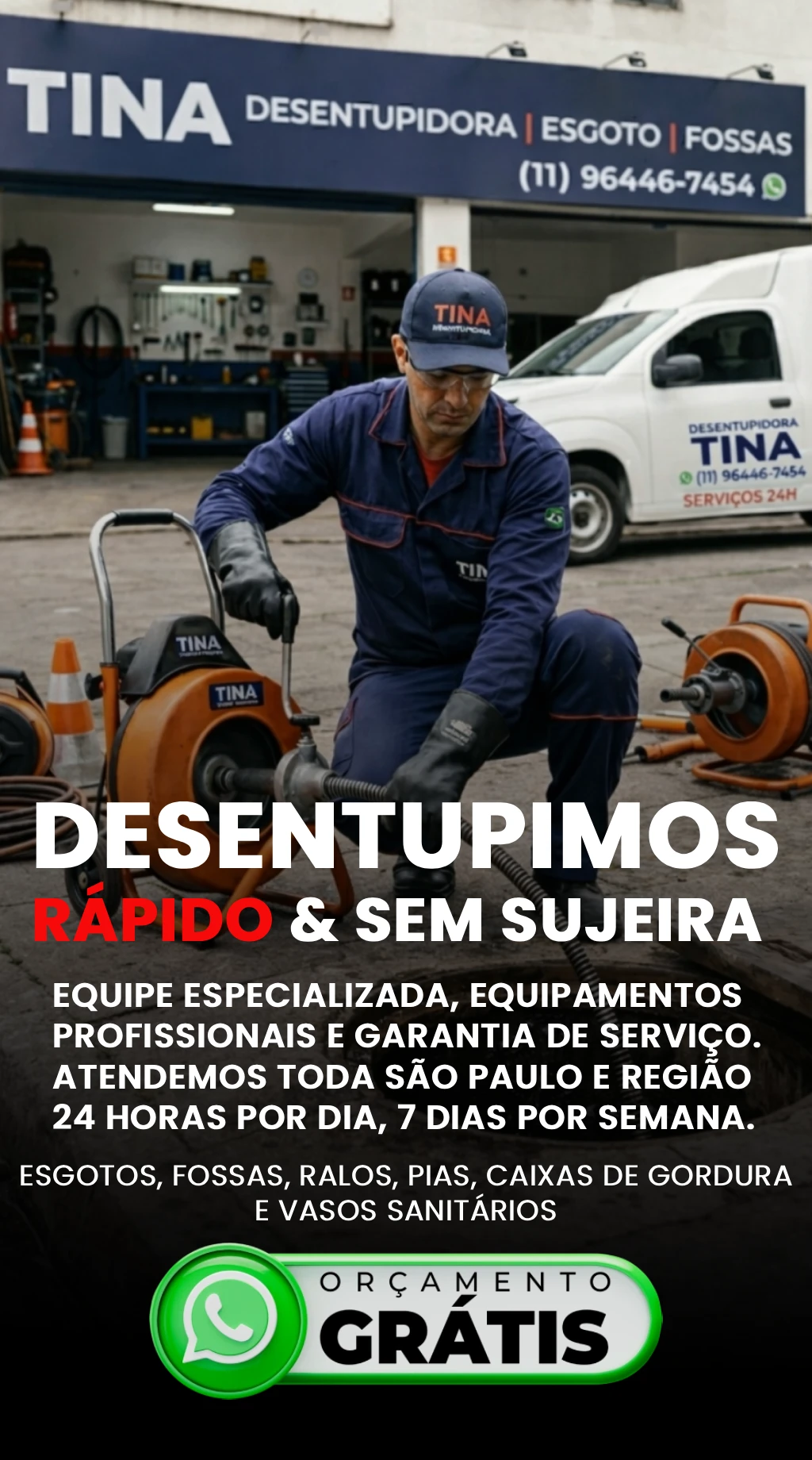 A Desentupidora Tina é a sua solução definitiva em toda São Paulo e Região. Unimos tecnologia de ponta e especialistas prontos para eliminar qualquer obstrução com agilidade extrema, limpeza total e o orçamento que cabe no seu bolso.